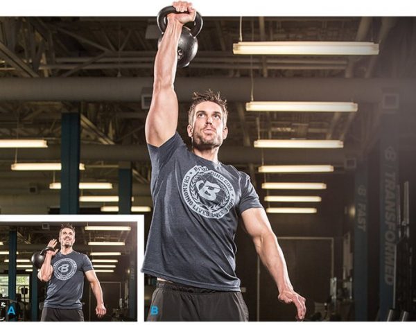 - При фиксации выпрямите ноги, следя за прямой рукой. Кисть удерживает гирю снизу, рука над плечом образует прямую линию с корпусом.