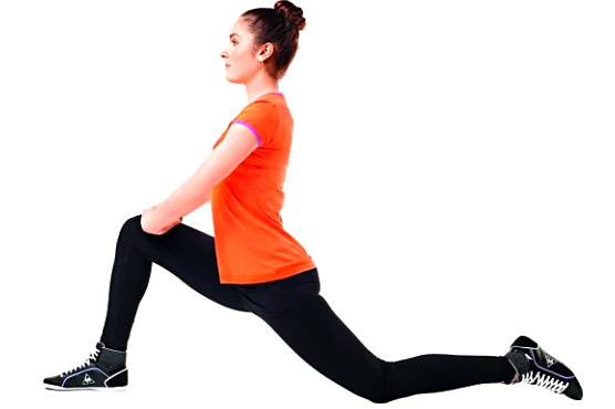 Сначала растянем мышцы передней части ног растяжкой в выпаде