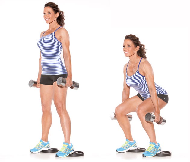 Плие. Это глубокие приседания с гантелей, акцентирующие нагрузку на приводящие мышцы бедра. Ноги ставятся шире плеч, носки разворачиваются в стороны. Держите гантель обеими руками перед собой. Приседайте, сохраняя спину прямой, ноги разведены, бедра параллельны полу. Вернитесь в исходное положение.