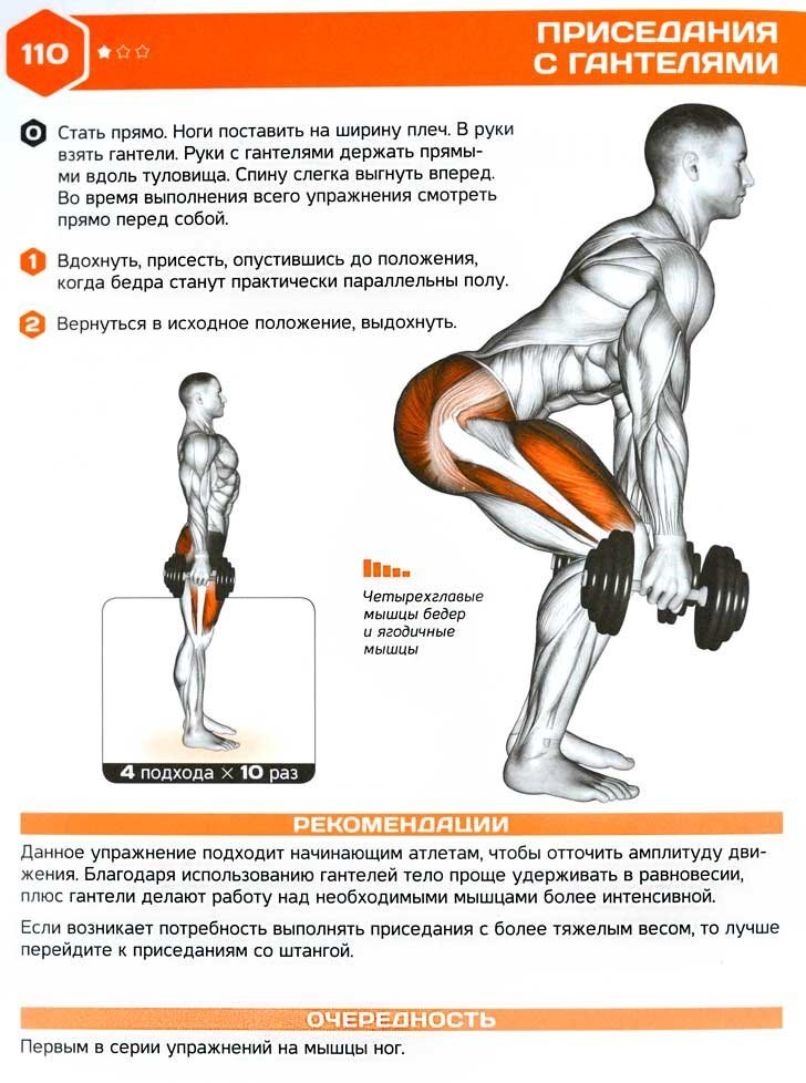 Ласковски, доктор медицины: Приседание — это упражнение с гантелями, которое тренирует мышцы бёдер и ягодиц. Приседание задействует ягодичные мышцы (вот здесь), подколенные сухожилия (вот здесь) и квадрицепсы (вот здесь).