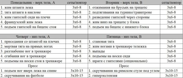 | Систематизированный подход к тренировкам | Ноги | Приседания со штангой, выпады со штангой, жим ногами, подъемы на носки |