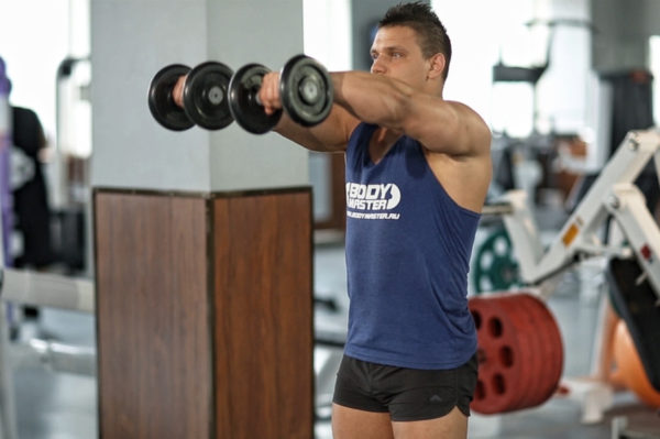 Для развития плечевых мышц и бицепсов полезно выполнять подъем гантелей перед собой. Встаньте прямо, руки вдоль тела, поднимайте снаряды вверх и медленно опускайте их. Включите в тренировку жим штанги на скамье: штанга на уровне груди, подъем и возврат в исходное положение. Также полезны подъемы гантелей в стороны и разводка в наклоне.