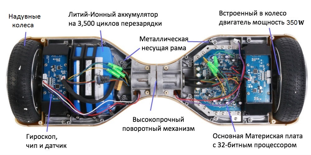 В каждом гироскутере есть процессор и материнская плата, обрабатывающие данные от датчиков и управляющие мотором.