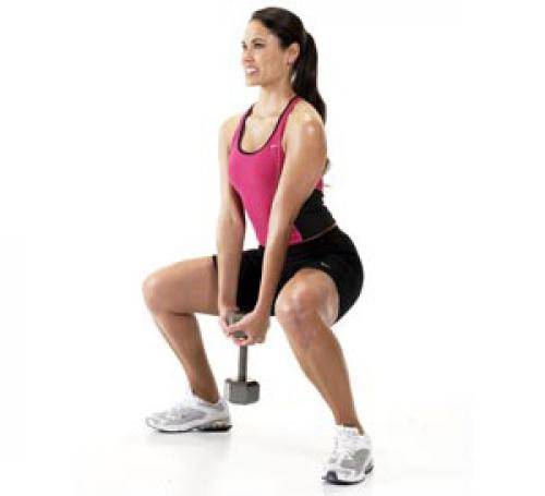 - Если захотите немного увеличить нагрузку, возьмите в руки гантель и удерживайте ее около груди во время приседов.