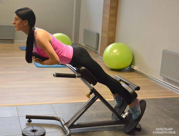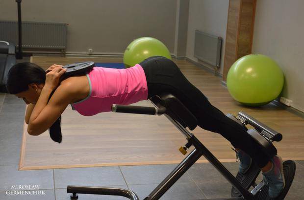 Во-первых, округлите спину: это снимет нагрузку с поясничного отдела и перенесет ее на ягодицы и бицепс бедра (одну из самых проблемных в плане накопления жировых отложений женских зон). Выполнять подъем в такой гиперэкстензии нужно усилием ягодиц, их вовлеченность будет ощущаться непосредственно, мышцы должны гореть. Не стоит забывать про отягощения: их необходимо подбирать в соответствии с вашей подготовкой. Удобнее всего брать диск и фиксировать его либо снизу, прижав к груди, либо сверху, на спине (предпочтительнее и безопаснее первый вариант).