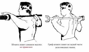 Расположение грифа. Штангу вы можете держать на плечах, лопатках или на передней дельте. Здесь нет универсального правила, и каждый подбирает что-то свое, обычно это золотая середина – на плечах. При расположении на плечах вся нагрузка будет распределяться между спиной и ногами. Такие нагрузки используются в фитнесе и бодибилдинге.