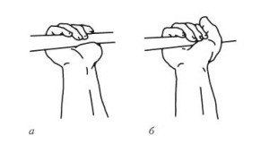 Хват. Обычно используют закрытый захват грифа (на рисунке положение б). Расстояние между руками на грифе не имеет большого значения. Необходимо учесть, что они должны быть расположены симметрично от центра. Это нужно для того, чтобы в момент приседания вы не потеряли равновесие.