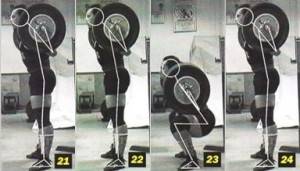 Для обучения правильному положению штанги используются фронтальные приседания «без рук» (Рис. 3), при этом в нижнем положении спортсмен вынужден несколько согнуть выпрямленные руки, чтобы предотвратить скатывание штанги (Рис. 3b).