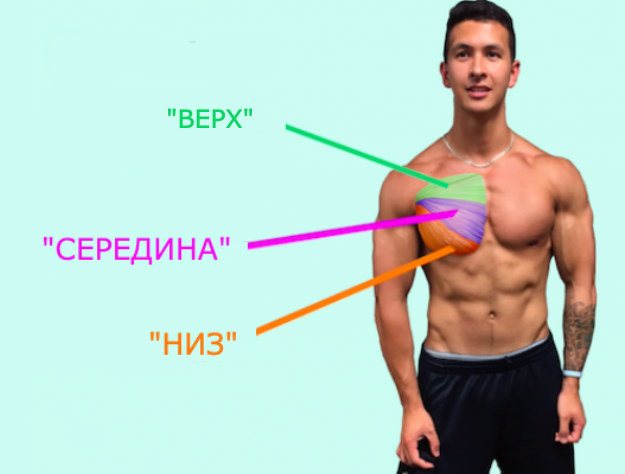 Большая грудная мышца хоть и выглядит единым мускулом, но все же разделяется на три отдела: ключичный (верхний), грудино-реберный (средний), абдоминальный (нижний).