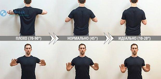 Разведение рук в стороны под углом 70-90 градусов — неправильно. Такая позиция потенциально травмоопасна для суставов. Большинство тренеров советуют 45 градусов — и это уже лучше. Но в идеале — 10-20 градусов к телу! Лопатки нужно свести, опустить вниз — а локти почти прижать к туловищу (10-20 градусов).