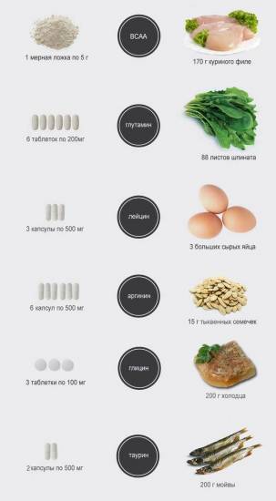 Аминокислоты так же принимаются по 2 порции (зависит от марки) порошка или таблетированной формы в день: