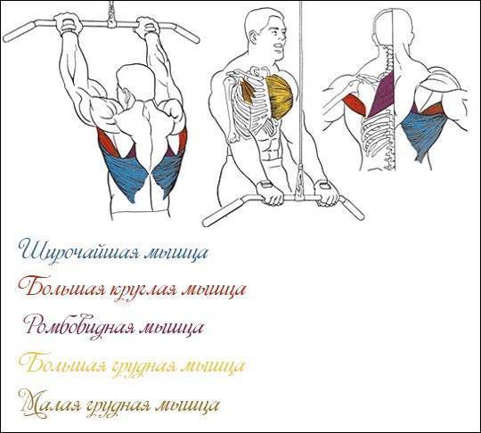 Кроме широчайших и больших грудных, нагрузку получают большая круглая и ромбовидная мышцы (расположенные на спине) и малая грудная (прикрытая большой грудной). Таким образом, данное упражнение является достаточно интересным и неоднозначным — однако безусловно полезным.
