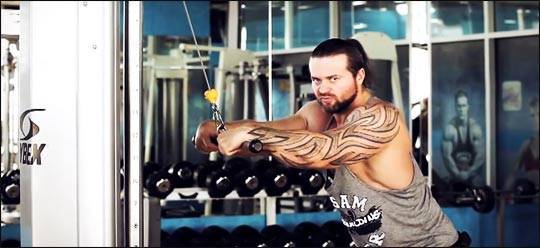 - Вдохнув, усилием грудных и широчайших мышц потяните рукоять вниз, удерживая руки прямыми в локтевых суставах.