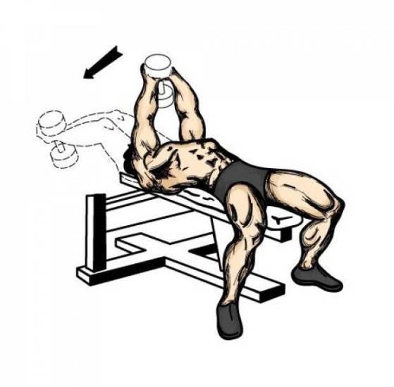Сначала нужно лечь на лавку; Берется спортивный снаряд. Не стоит сразу выбирать самый большой вес. Снаряд располагается над собой вертикально; При вдохе снаряд не спеша опускается за голову, конечности немного согнуты в локтях. Во избежание травм не рекомендуется опускать его очень низко. Должно быть ощущение, что мускулатура растягивается; Сделав выдох, возвращаемся в исходную позицию и при этом выпрямить полностью руки.
