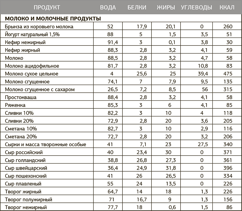 Для ежедневных вычислений очень удобно всегда иметь под рукой информацию о каждом ингредиенте. Распечатайте приведенную ниже таблицу и, хотя бы на первых порах, найдите для нее местечко на кухне.