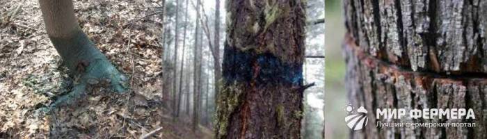 - Намазывание на кору. Подходит для растений с тонкой корой. Препарат смешивается с маслом для усиления впитываемости, затем намазывается на поверхность в полуметре от грунта. Способ применяется в любом месяце. Если дерево сочится, лучше полить химикат под корень или опрыскать листья.