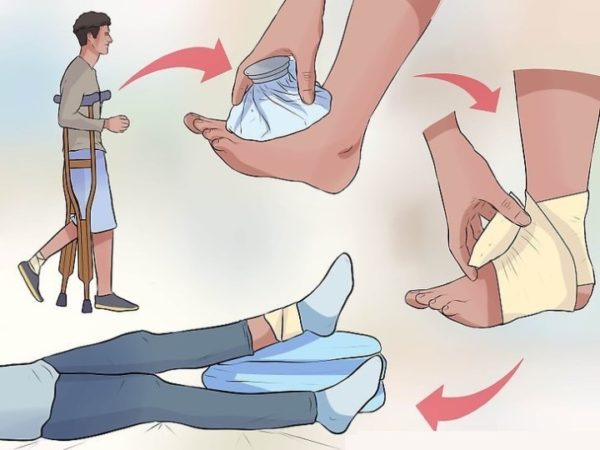 Первоочередным механизмом лечения выступает ограничение подвижности конечности, которое позволяет тканям самостоятельно восстановиться, и избежать повторного травмирования. Обездвиживание сустава может происходить за счет тугой повязки, которую накладывают восьмеркой, или гипсовой повязки, используемой при сильных повреждениях.