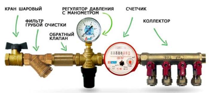 Суть работ идентична. Отличие – наличие помпы, обеспечивающей жильцов водой. В этом случае точка врезки – вход трассы в здание, после водомера. На рынке продаются комплекты, в которые входит не только редуктор, но и насос. Подключают их таким образом, чтобы в случае просадки давления последний включался автоматически. Это даст возможность поддерживать постоянные эксплуатационные параметры.