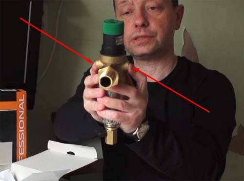 Имеет смысл врезать патрубки для установки манометров. Квартирные регуляторы давления должны быть вертикально сориентированными. Горизонтально и диагонально их монтировать запрещено. На корпусе устройства имеется отметка, указывающая направление движения жидкости.