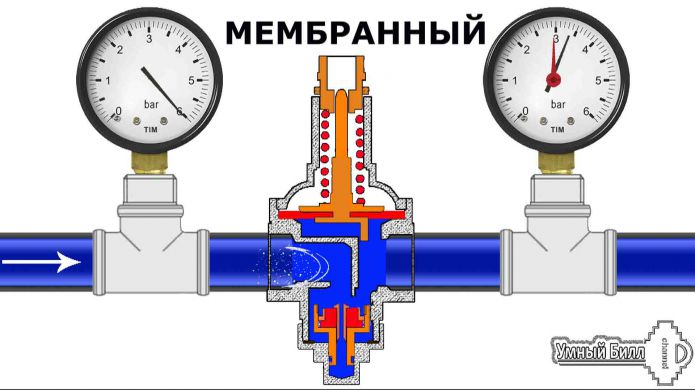 - Мембранные. Работой регулятора силы струи руководит армированная мембрана, которая приводит в движение пружину по мере потребления воды или расхода теплоносителя. Мембранным редукторам свойственна точность формирования давления воды, лучшая пропускная способность и большой ресурс. Минусом признаны высокие ценники.