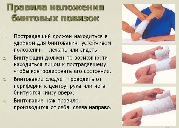 | Кратко-растягивающийся (хлопковый) | Спиральный, восьмиобразный, возвратно-поступательный | Наложение без натяжения, равномерное перекрытие витков на 1/2-2/3 ширины бинта, фиксация концов бинта булавками или липучками, контроль кровообращения |