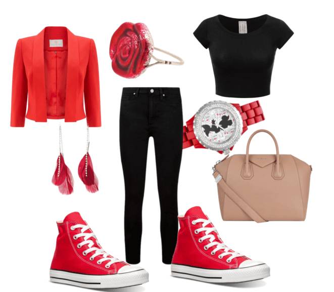 Пара красных кедов станет отличным дополнением к образу при правильном выборе одежды и аксессуаров. Наиболее выигрышным считается сочетание с черным цветом, подходящее как мужчинам, так и женщинам. Также хорошо смотрится комбинация с белым, золотым, мятным и различными оттенками красного. Эти универсальные кеды вписываются в большинство современных стилей: кэжуал, кэжуал-смарт, панк, спорт-шик, деловой и фьюжн.