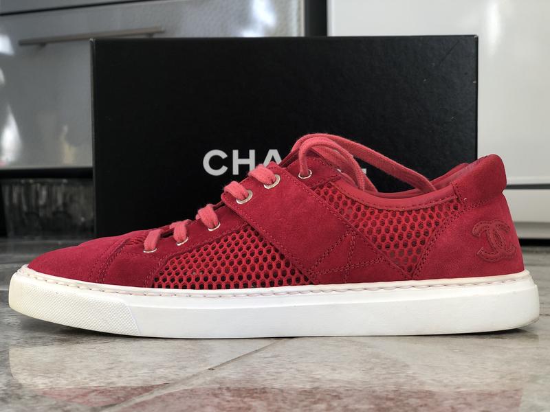 - CHANEL. Элегантные кеды этого бренда сочетают красные и белые оттенки. Верх выполнен из натуральной замши или кожи с возможными комбинациями материалов. Присутствует фирменный логотип.