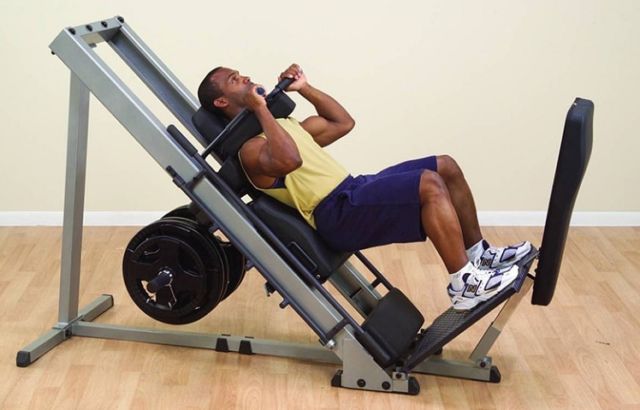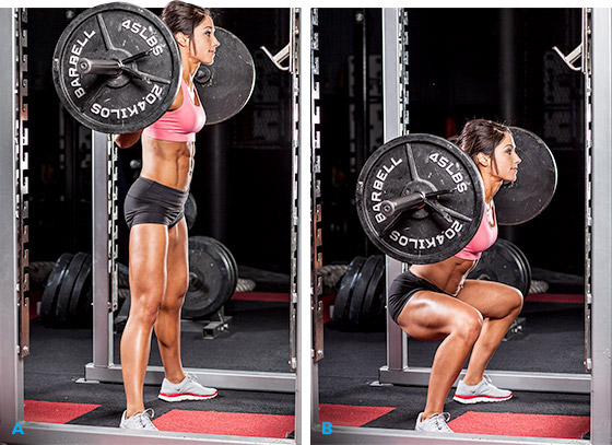 Приседание со штангой на груди выполняется на специальном тренажере. Исходное положение — спиной к скамье, упор на подставки, ноги на ширине плеч. При вдохе начинается медленное движение вниз с поднятой головой. Полностью опустившись, надо резко оттолкнуться пятками и выпрямиться. Эта версия подойдет и для мужчин, и девушкам.