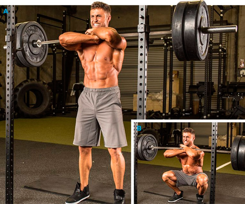 Штанга располагается параллельно телу. Затем выполняются глубокие приседания, при которых гриф перемещается. Локти разводятся на уровень плеч, а костяшки пальцев направлены вверх. При опускании штанга плотно прилегает к телу.