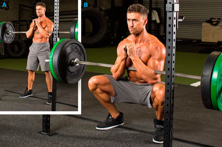 В данном случае перед тем как делать присед, отягощение располагается на уровне груди. При движении вниз локти идут вперед. Эту модификацию классического варианта часто используют тяжелоатлеты. Минимальный наклон спины способствует значительному уменьшению нагрузки на позвоночник.