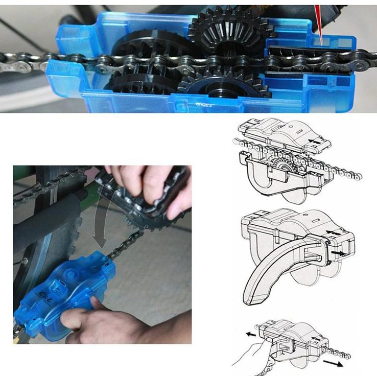 Внутри цепемойки находятся небольшие щетки и шестеренки. В полость этой машинки наливается растворитель (входит в комплект). При вращении педалей сквозь него проходят все звенья цепи. Преимущества такого способа: