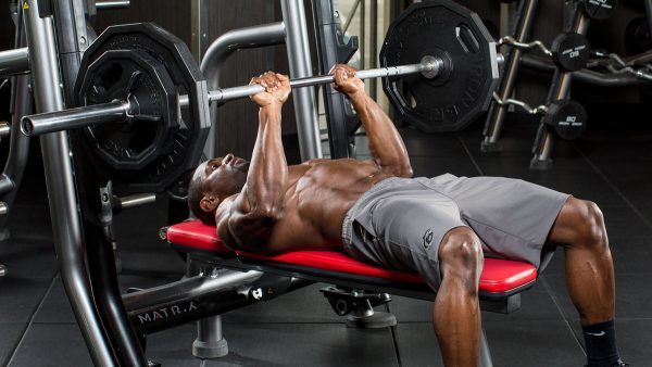 - На горизонтальной скамье штанга опускается чуть ниже сосков, на наклонной — между сосками и ключицей.