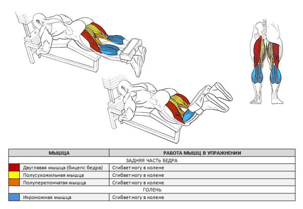 Сгибание ног, независимо от положения, относится к изолирующим упражнениям, предназначенным для целевых занятий на одну мышцу или их группу. Поэтому здесь работает исключительно бедро, конкретно — его задняя поверхность (бицепс). Совсем незначительно к процессу подключаются икроножные, подколенные, ягодичные мышцы. Их помощь при работе с тренажером минимальна.