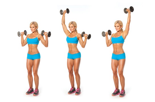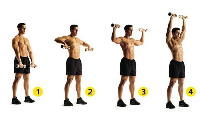 - Подъем гантелей вверх и вперед. Их следует поднимать строго над головой.