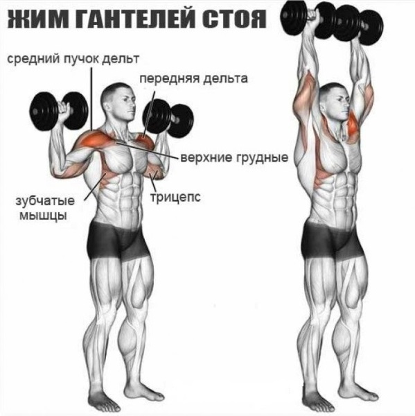 Жим с гантелями в положении стоя при правильном выполнении упражнения, максимально нагружает дельты, а также зубчатую мышцу плеча и трапеции на спине (их средняя и нижняя области). За стабильное положение и максимальный дожим до верхней точки отвечает трехглавая мышца плеча (разгибатель руки). Совсем небольшое усилие для стабилизации корпуса идет на брюшной пресс, поясницу и бедра. На руках незначительно, но работают бицепсы и трицепсы.