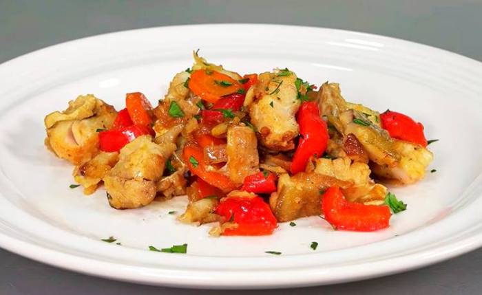 - Филе нарезаем на небольшие кусочки. Не слишком мелко, в произвольной форме измельчаем овощи.