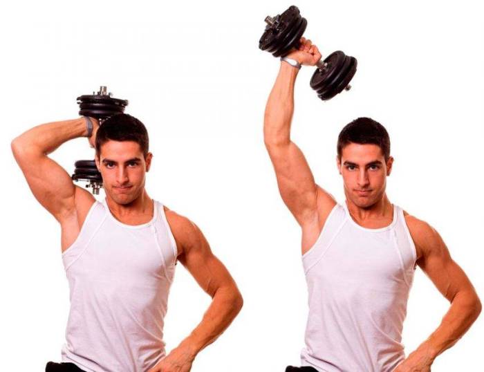 Могут выполняться двумя руками либо по одной. Вес выводится за голову, рука сгибается в локтевом суставе, а затем разгибается.
