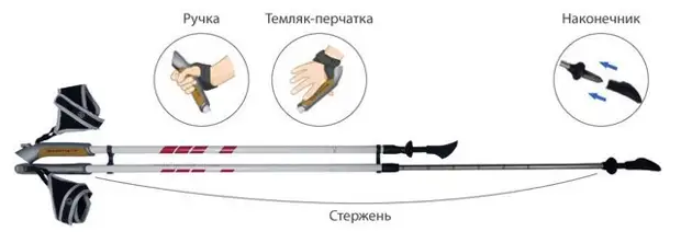 Особое назначение имеет темляк – широкий съемный ремень. К палкам пристегивается с помощью кнопок, фиксируется на запястьях захлестом таким образом, чтобы не нарушить кровообращение. Ремень идет в комплекте с палками и предназначен для их удерживания при движении назад и захвата при движении вперед (то есть рукоятку можно отпустить, а затем легко захватить и опереться на нее).