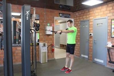 - На плечи: выполнение армейского жима, тяга стоя к подбородку, отведение рук назад, в стороны и вперёд. Стопы фиксируют трос, а руки держат его концы.