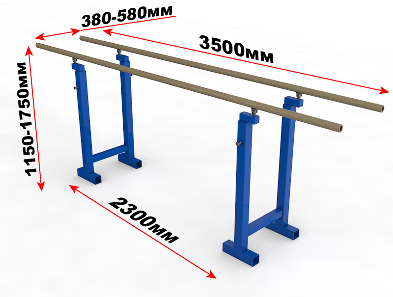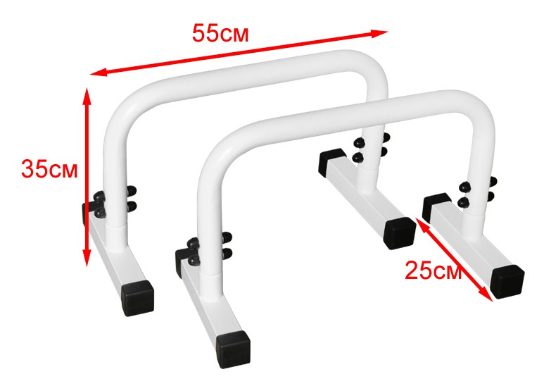 Основные характеристики: высота брусьев 1400 мм, длина рабочей поверхности 1500 мм. Высота упоров для отжимания 300 мм, высота упора для ног 600 мм.