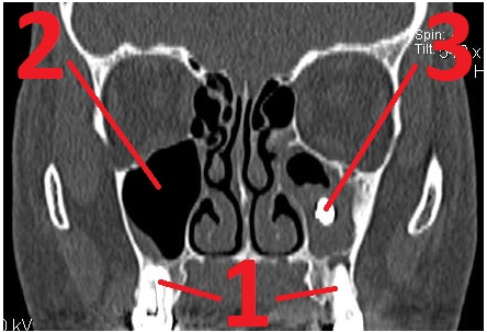 1 – корни зубов, 2 – кисты верхнечелюстных пазух, растут от корней зубов (кисты – округлые «пузыри», на снимке выглядят серыми).