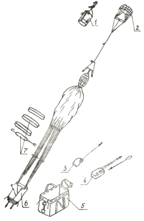 - Стабилизирующая система и купол. Она включает основу купола, стропы, стабилизатор со звеном. Все вместе весит 0,93 кг, необходимо для стабилизации снижения после прыжка. Купол тоже капроновый, в полностью раскрытом виде представляет собой усеченный конус. Площадь большей плоскости — 1,5 м². Помимо основы, имеет вытяжное устройство в полюсной части, настроченные радиально и по низу ленты, играющие роль «ребер жесткости». Под последнюю ленту продевают и пристрачивают 16 строп длиной 50–52 см.