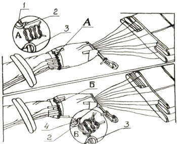 После этого нужно развязать концы подстилки, открывая нижний край купола. Клапаны ранца расправляют. На верхнем есть отворот с «кармашком», его «вкладывают» между лямками подвесной системы и пучками строп.