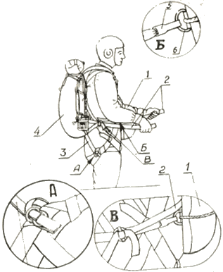 - Подвесная система. Нужна для крепления парашютов (основного и запасного) к спине парашютиста. Представляет собой конструкцию из лент общим весом 2 кг, фиксирующихся на груди, обхватывающих ноги и плечи. Пряжки и карабины позволяют подогнать ее под себя индивидуально.