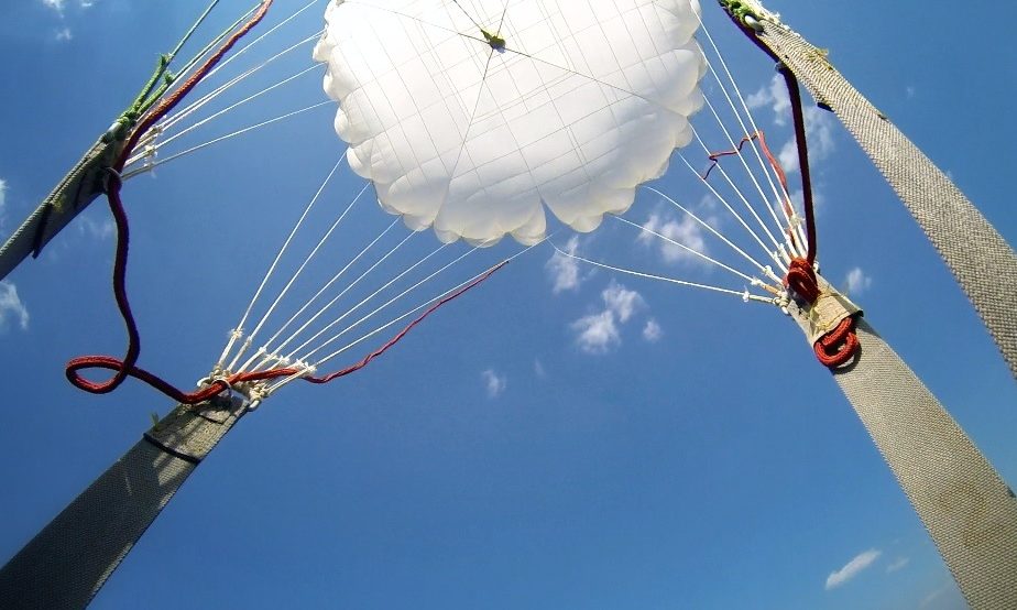 - Стропы. Сделаны из красного капронового шнура, продеваются через кольца подвесной системы. Необходимы для управления парашютом.