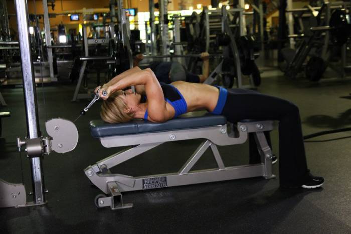 При опускании рукояти к лбу активируются медиальная и латеральная головки трицепса, а длинная головка включается, когда рукоять заходит за голову. Блок «подтягивает» руки назад, что поддерживает постоянную нагрузку на трицепс и способствует увеличению его силы.
