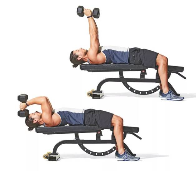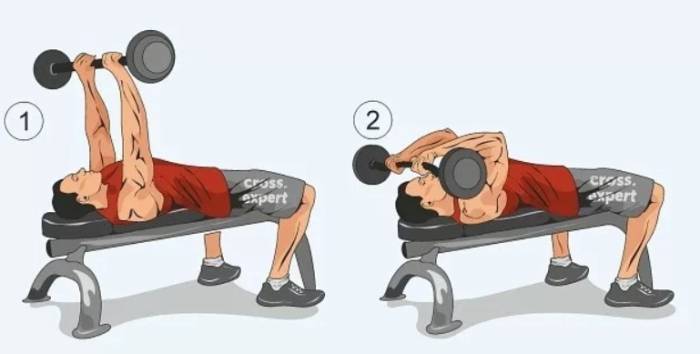 Преимущество варианта французского жима гантелей лежа — возможность лучше контролировать работу трицепса и распределить нагрузку на все его три головки равномерно: