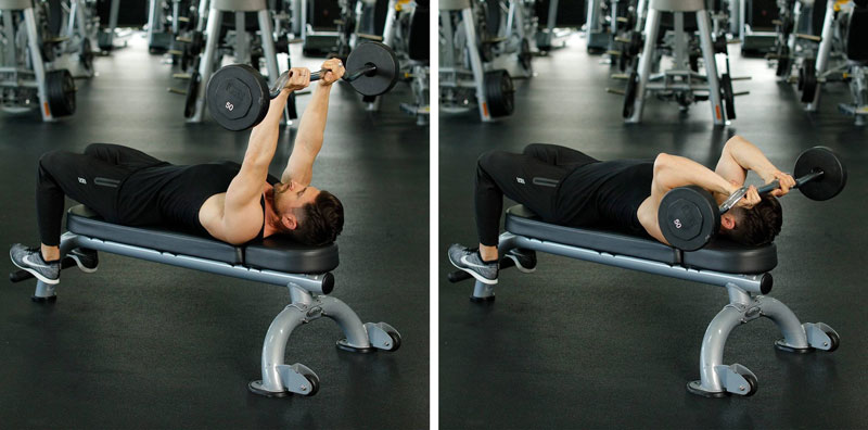 Разгибания и сгибания рук должны быть плавными, локти неподвижными и не расставленными. Эффективно тренировать трицепсы можно с 1-2 упражнениями на длинную головку (например, тяга гантели за головой или работа со штангой), затем добавьте по одному упражнению на медиальную и латеральную головки (гриф направляется к лбу).