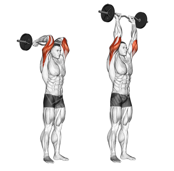 - Исходное положение — вытянуть руки со штангой вверх над головой, не расставляя локти. Часть руки от локтя при выполнении сета должна оставаться рядом с головой. Ее направление — перпендикулярно полу, а самих локтей — ближе к туловищу.