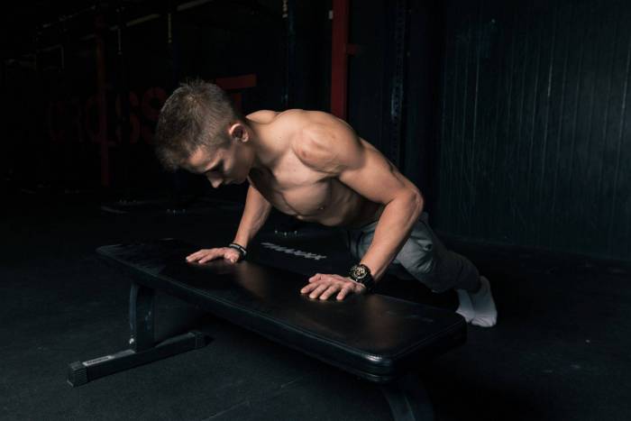Примите упор лежа, поместив руки на скамью. Начните сгибать руки в локтях, серединой груди касаясь опоры. Достигнув максимальной точки движения, выдохните и вернитесь в исходное положение. Помните о том, что спина и ноги должны образовывать один угол в 90 градусов. Прогибаться нельзя.